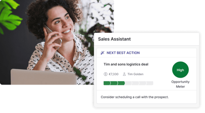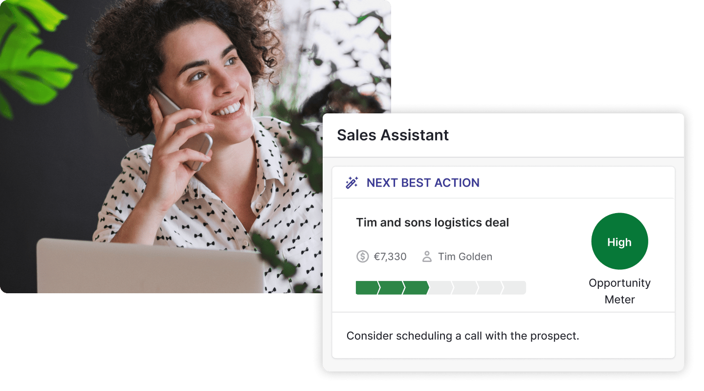 Always know what to focus on next with the help of your AI-powered sales assistant. Using AI to continuously analyze your deals, contacts and emails, Sales Assistant finds the most valuable insights in your sales data and suggests ways you can significantly improve your sales success.