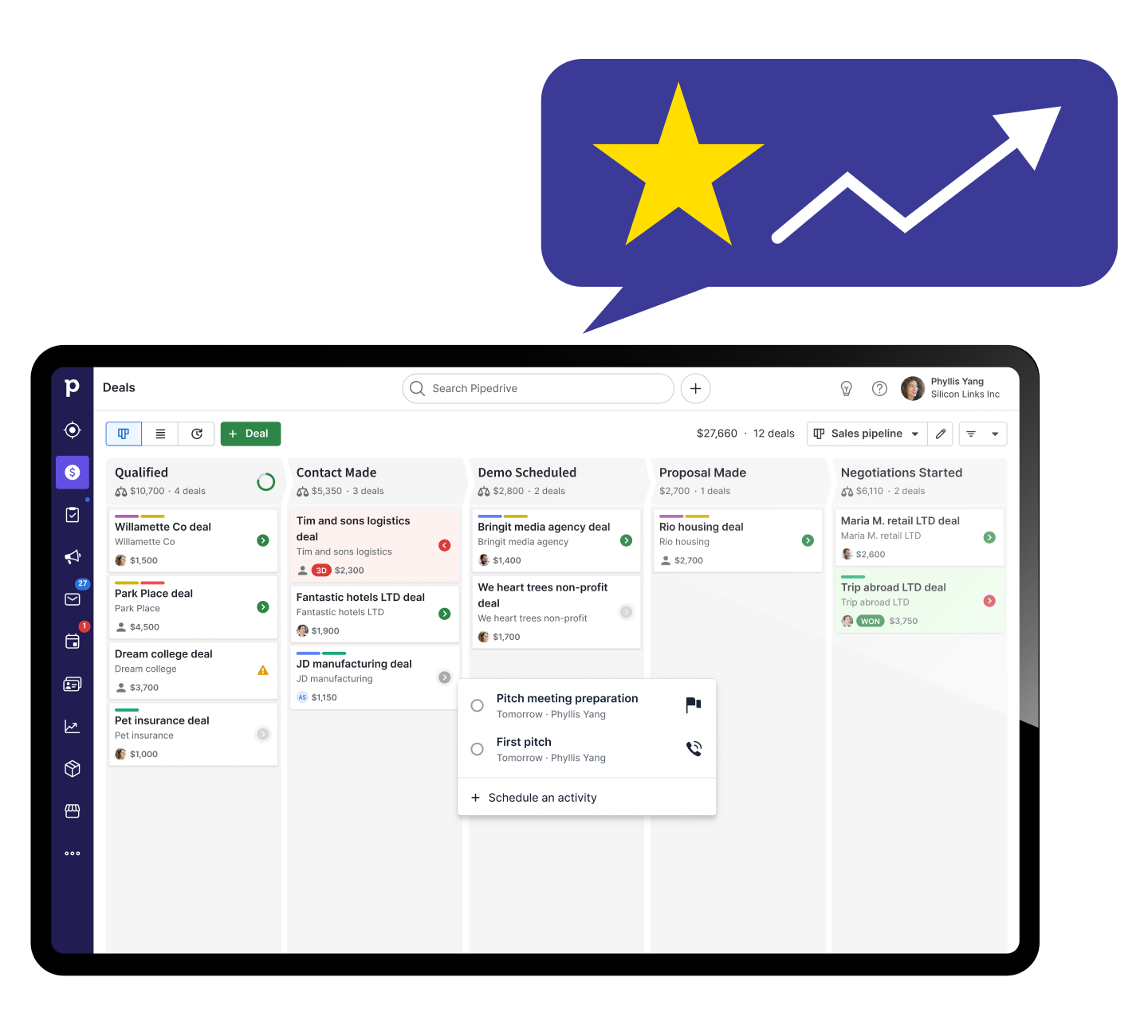Startup CRMs enable new businesses to focus on growth, enabling you to oversee performance in a single platform so you can identify opportunities to grow your business. Pipedrive helps you keep your eyes on the prize so you meet your goals.